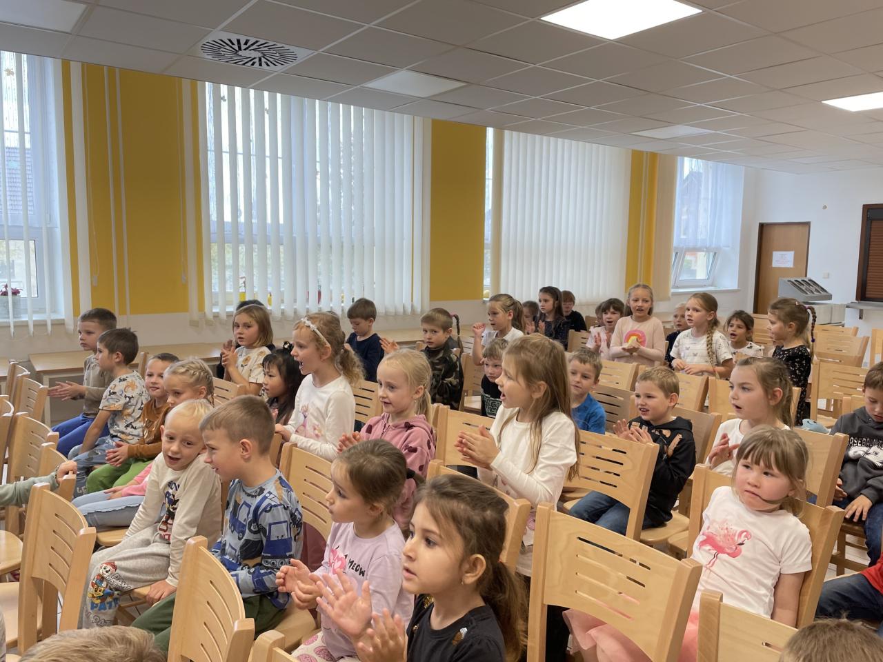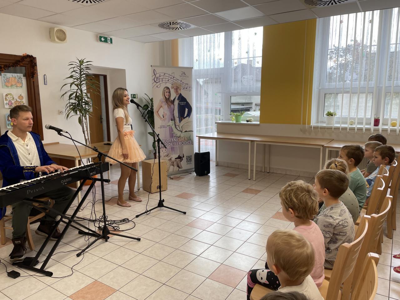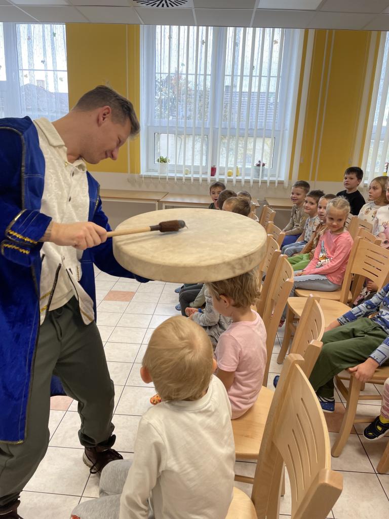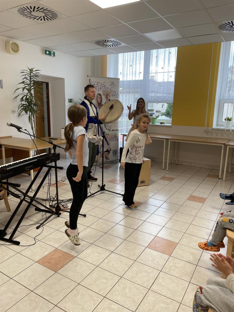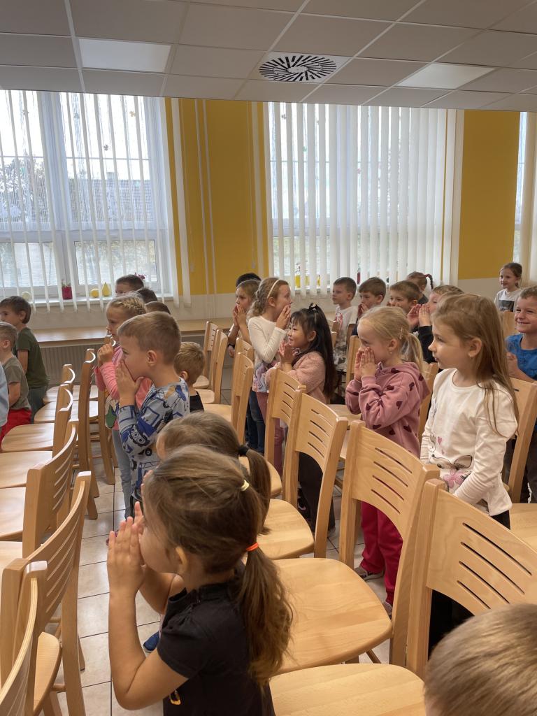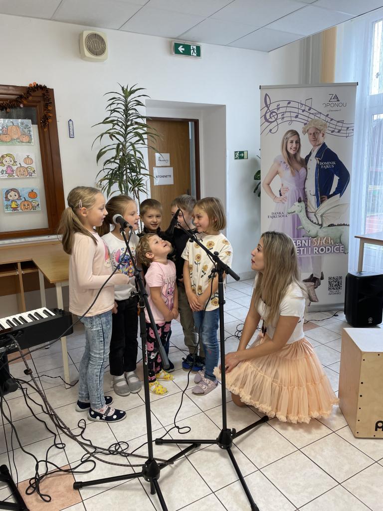 Začínalo se známými písničkami Prší,prší a Holka modrooká, které pan Fajkus naučil děti zpívat v novém kabátě a obohatil je pohybovými aktivitami.
